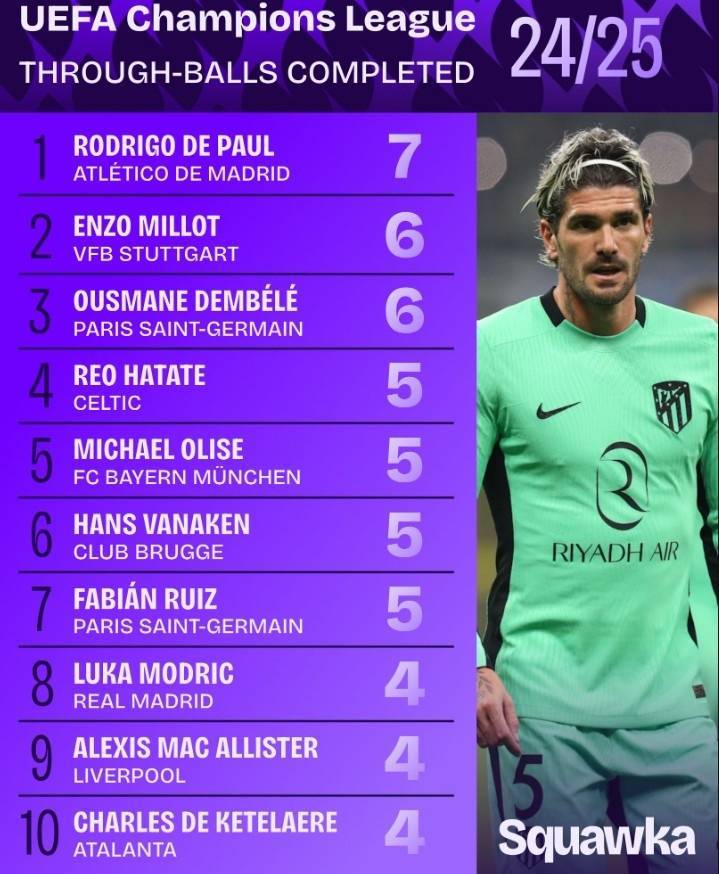直播吧6月2日讯 2024-25赛季的欧冠已经落下帷幕,巴黎圣日耳曼以5-0的比分大胜国米夺冠。Squawka统计出了欧冠多项数据排名情况,马竞中场德保罗以7次位居直塞榜榜首。